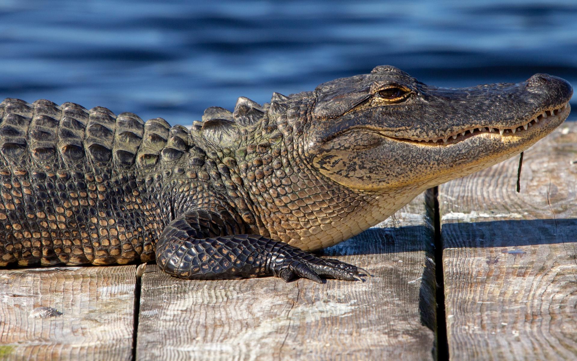 Wallpaper Alligator lies on a bridge near the water