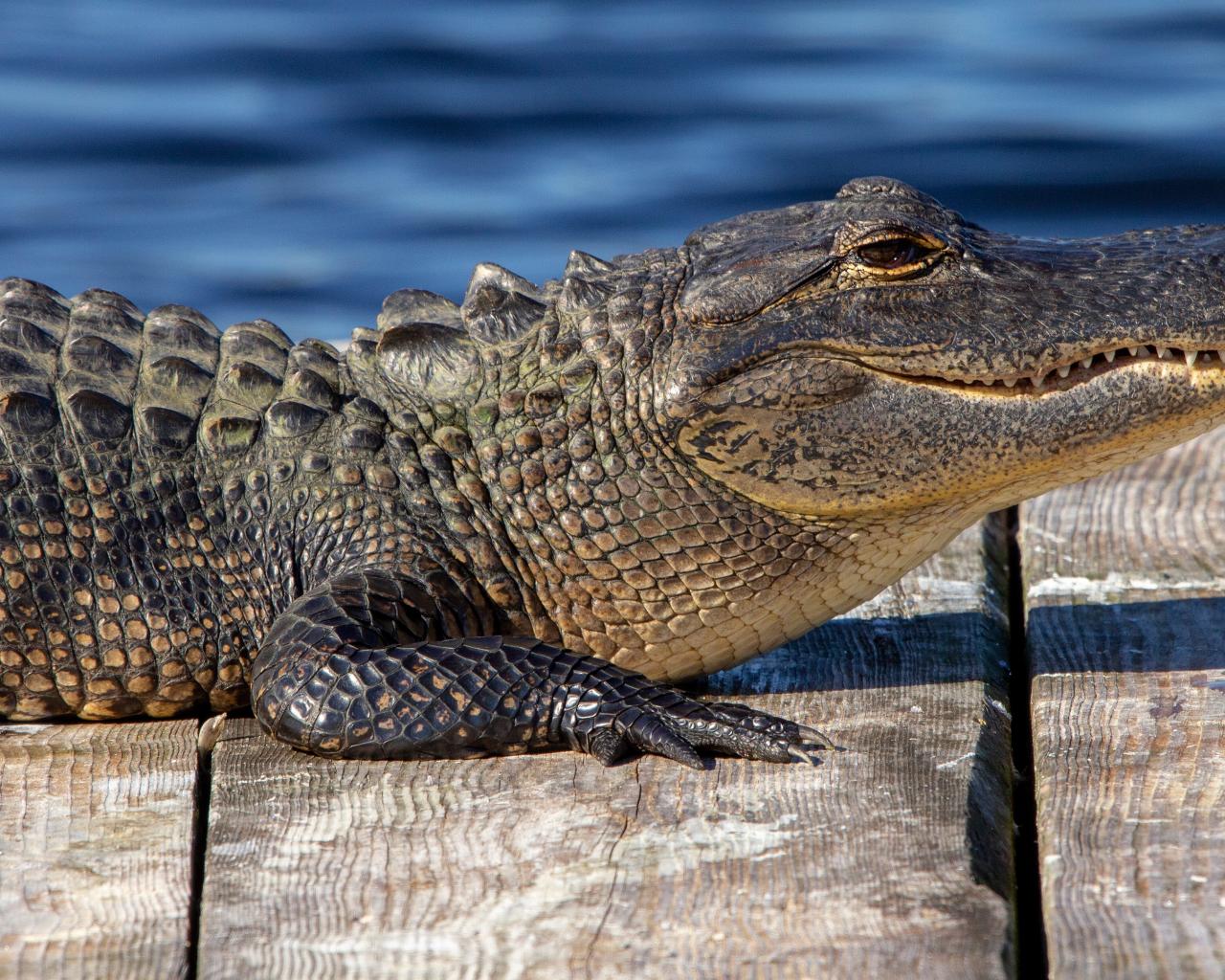 Wallpaper Alligator lies on a bridge near the water