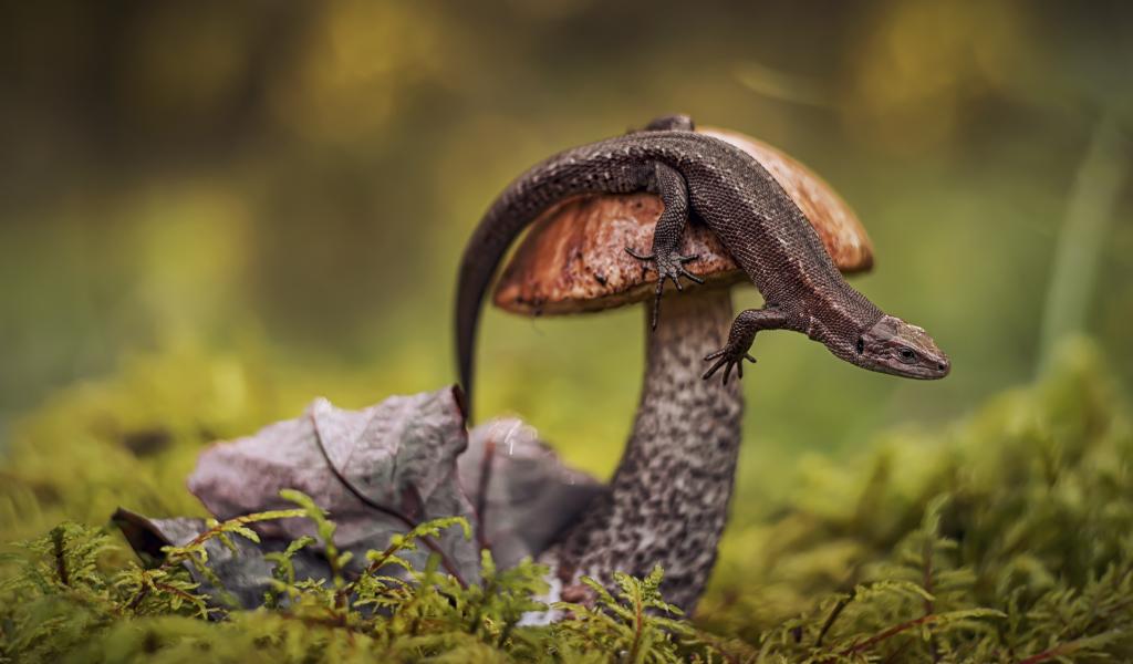 Wallpaper Lizard sits on a mushroom in the forest