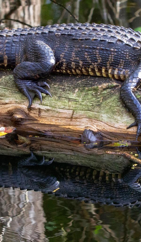 Wallpaper A large alligator lies on a dry tree in the water
