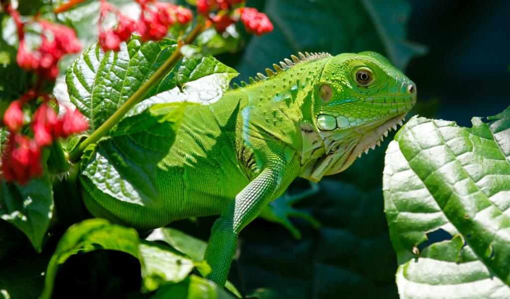 Wallpaper Large green iguana on a background of red flowers