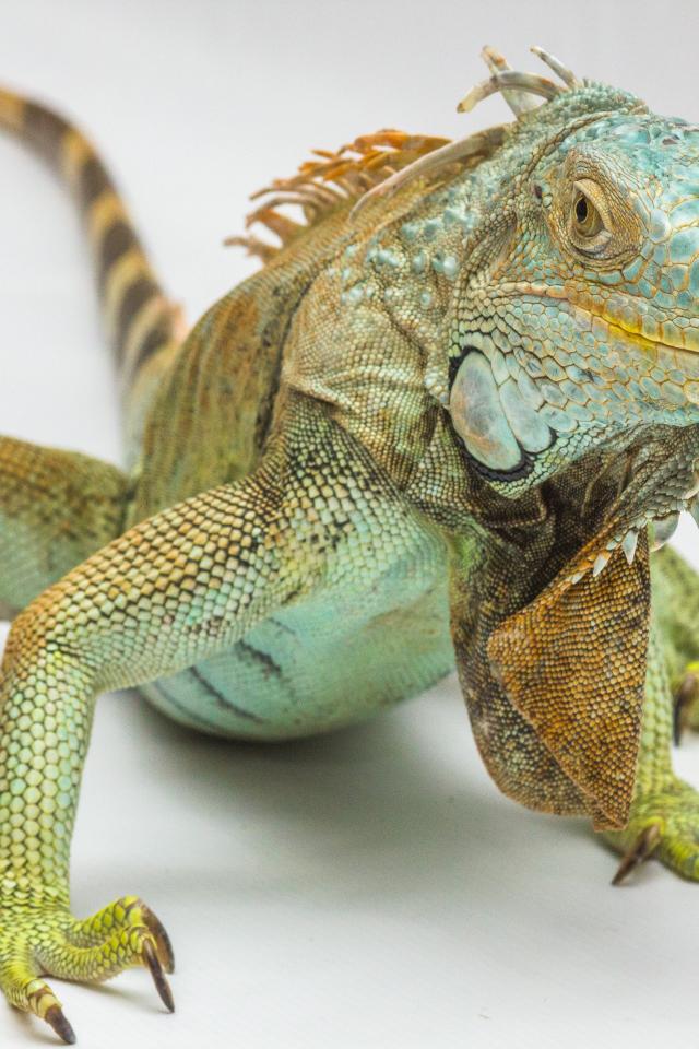 Wallpaper Large green iguana on gray background