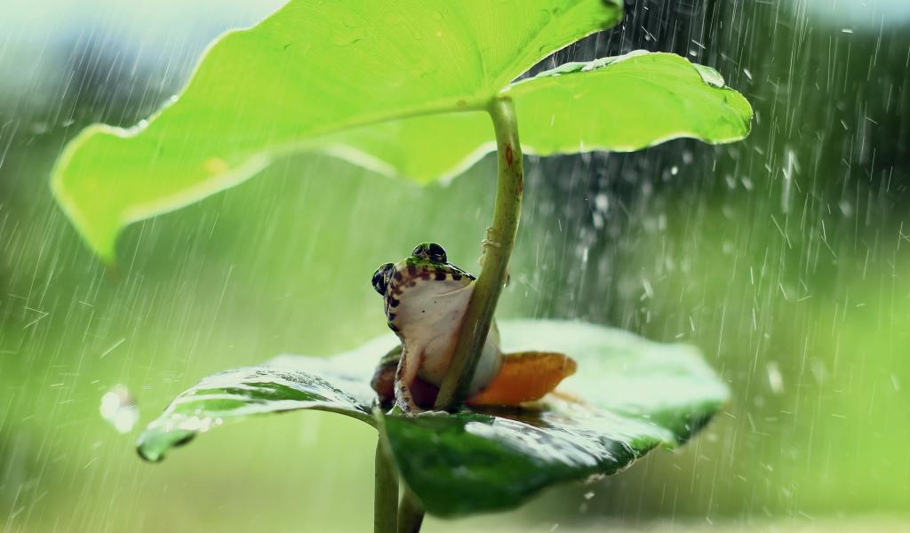 Wallpaper Little frog sits under a green leaf in the rain