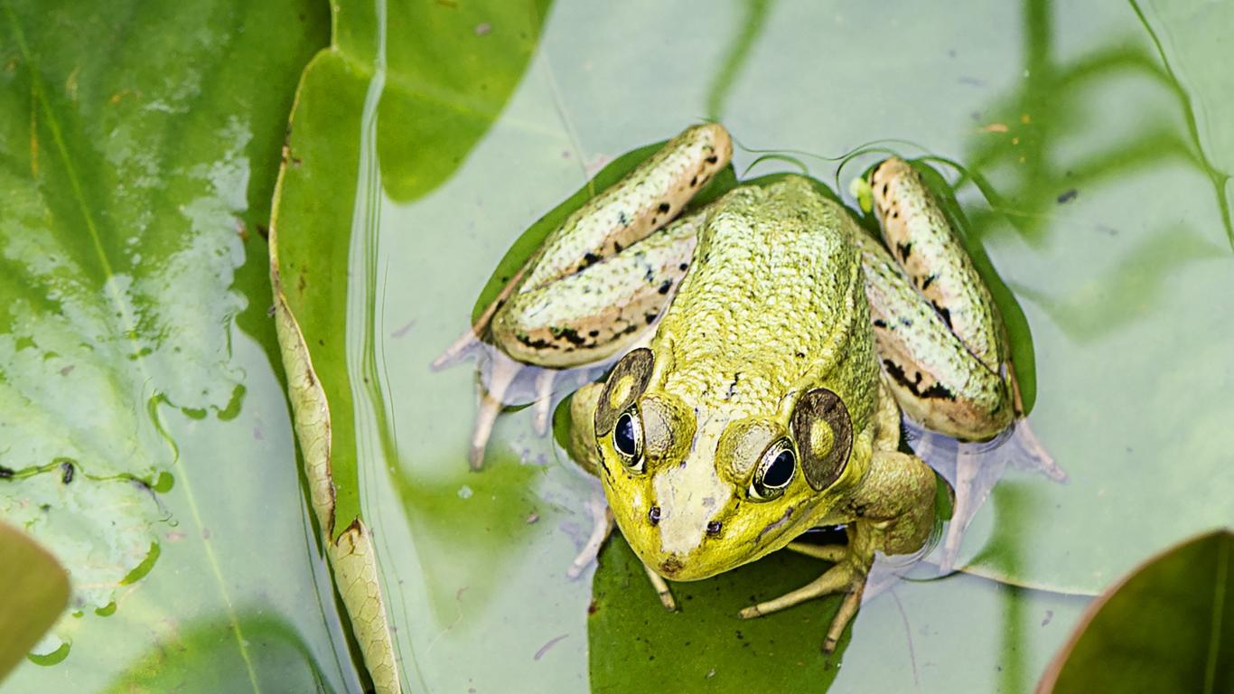 Wallpaper Green frog sitting on a leaf in the water