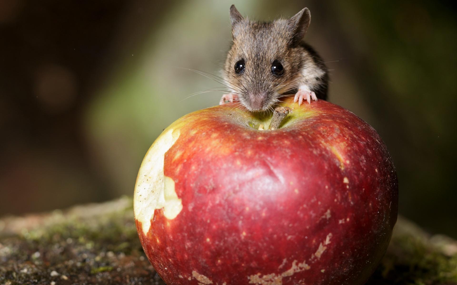 Wallpaper A little mouse sits on a big red apple