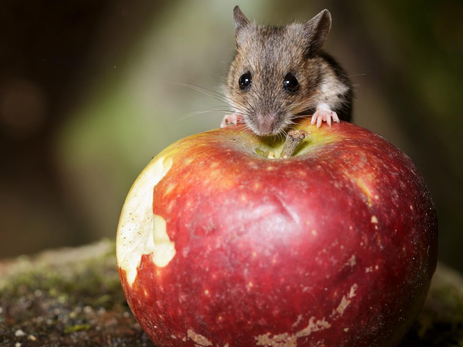 Wallpaper A little mouse sits on a big red apple