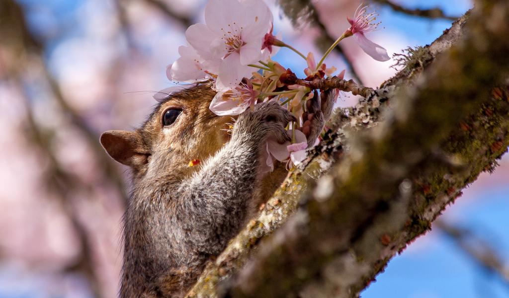 Wallpaper Squirrel sniffing a spring flower on a tree