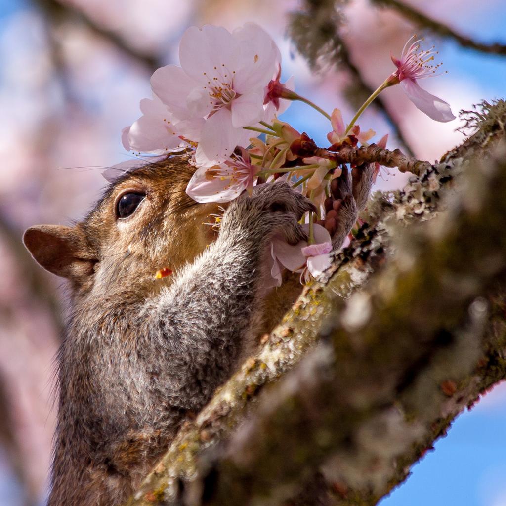 Wallpaper Squirrel sniffing a spring flower on a tree