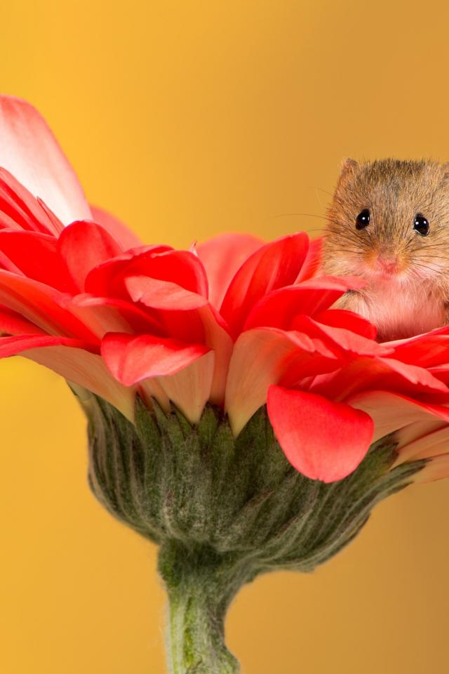 Wallpaper A little funny mouse sits on a red gerbera flower