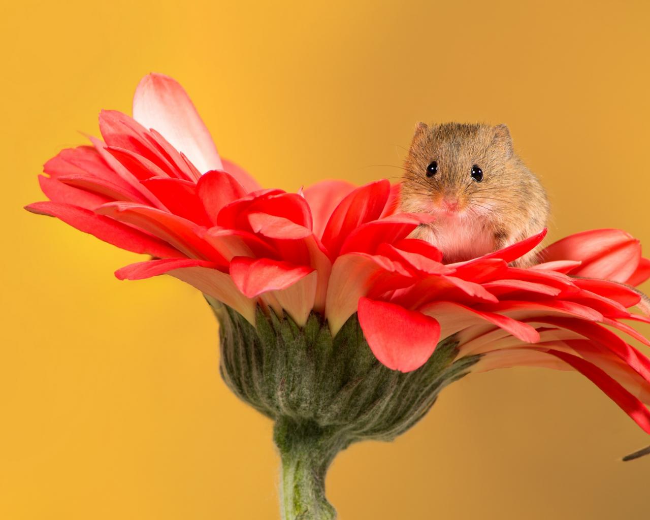 Wallpaper A little funny mouse sits on a red gerbera flower