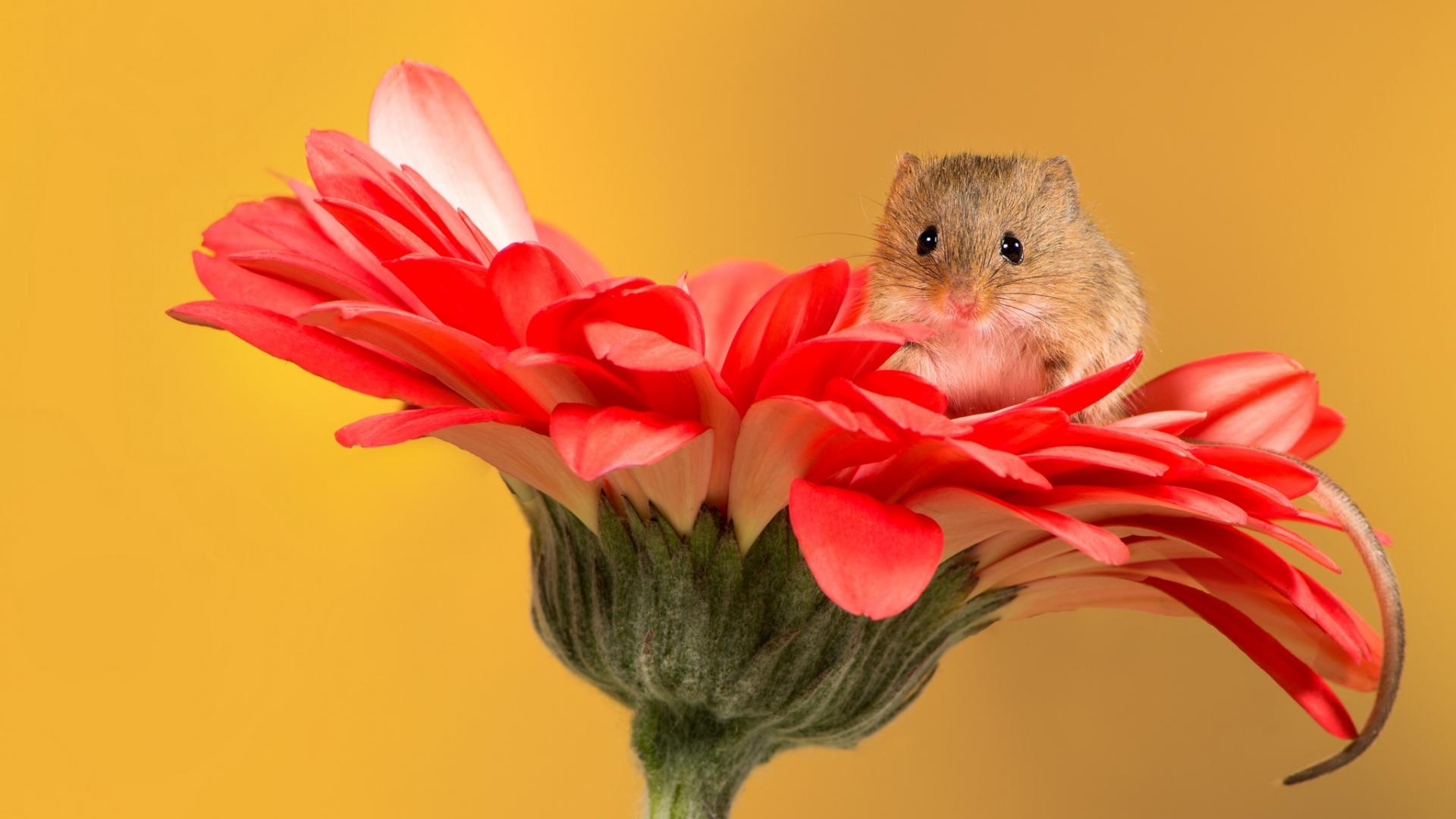 Wallpaper A little funny mouse sits on a red gerbera flower