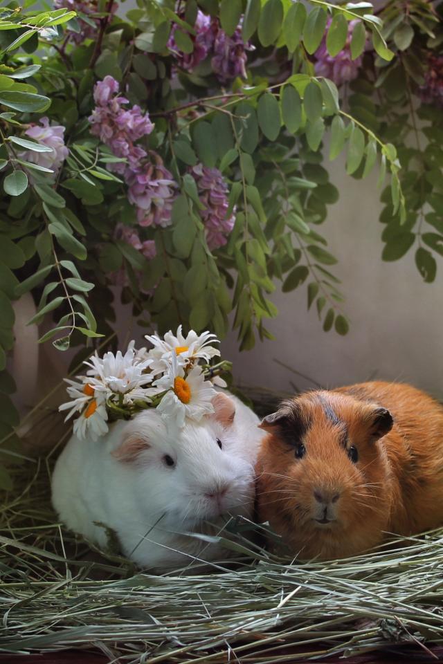 Wallpaper Two guinea pigs are sitting on a barrel of flowers