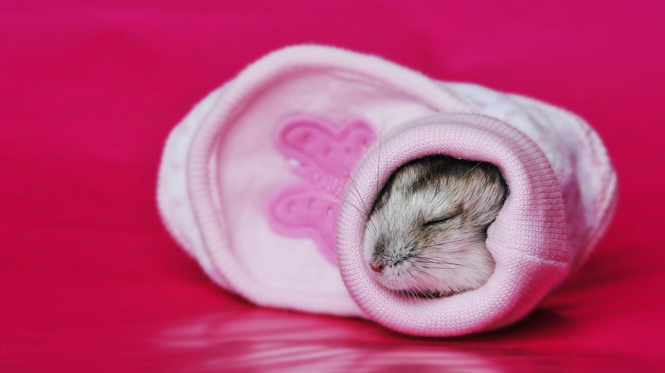 Wallpaper A little cute hamster is sleeping in a pink sock