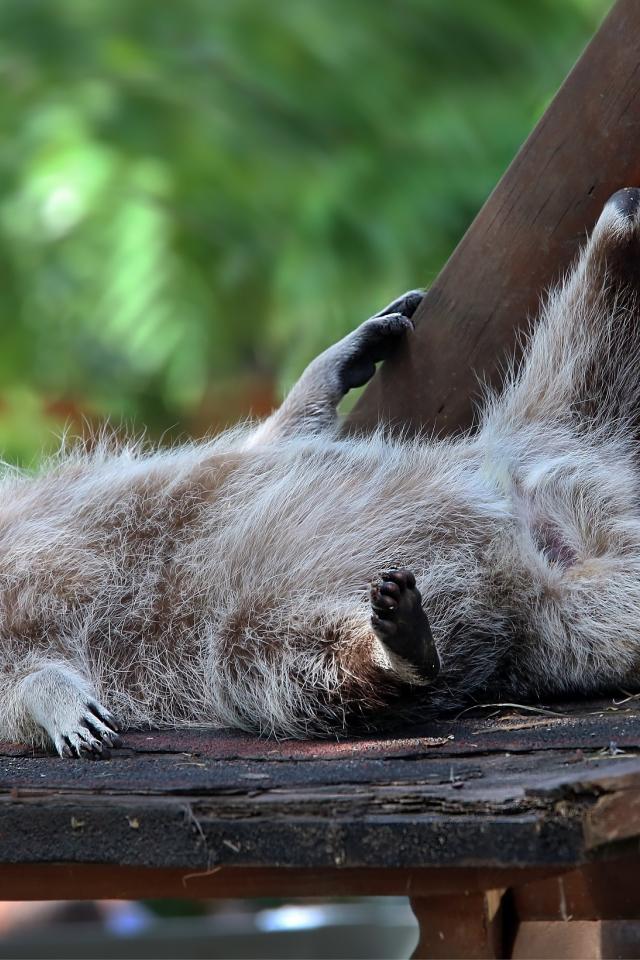 Wallpaper A lazy raccoon lays on a bench