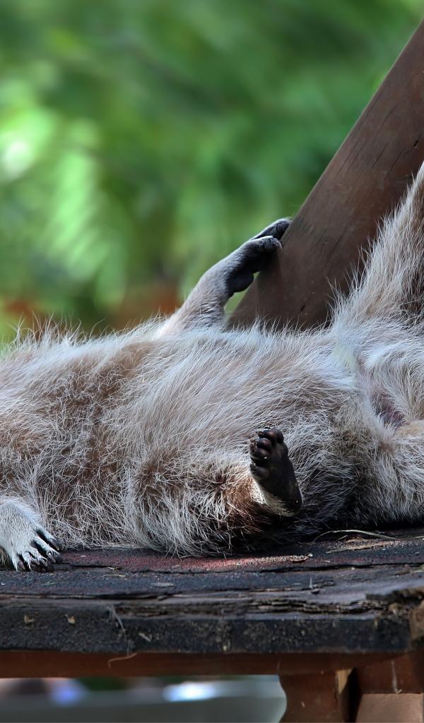 Wallpaper A lazy raccoon lays on a bench
