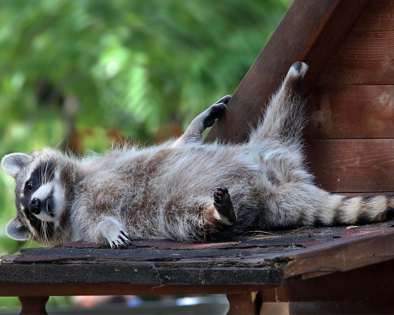 Wallpaper A lazy raccoon lays on a bench