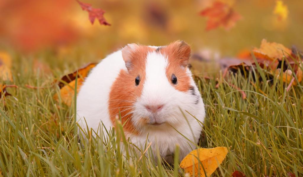 Wallpaper A sweet guinea pig sitting on the grass with fallen leaves