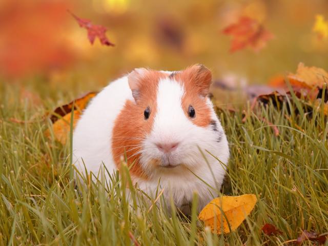 Wallpaper A sweet guinea pig sitting on the grass with fallen leaves