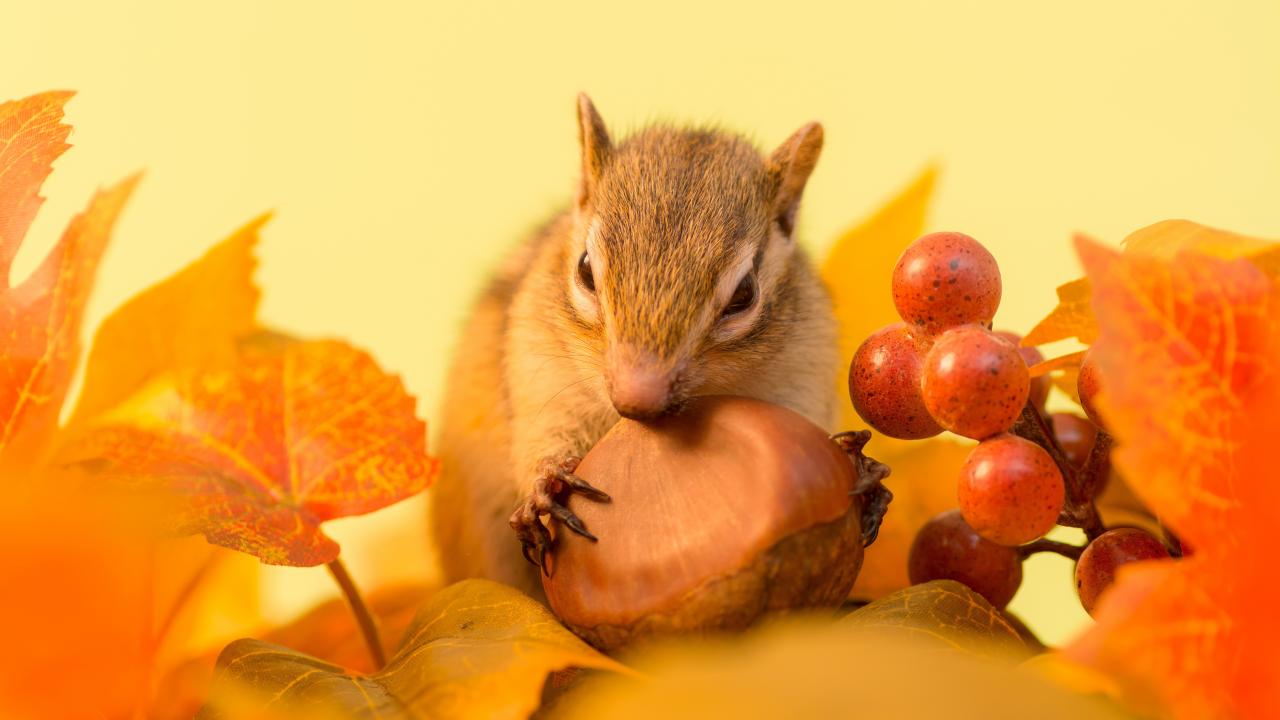 Wallpaper A small red squirrel gnaws a nut in the yellow leaves