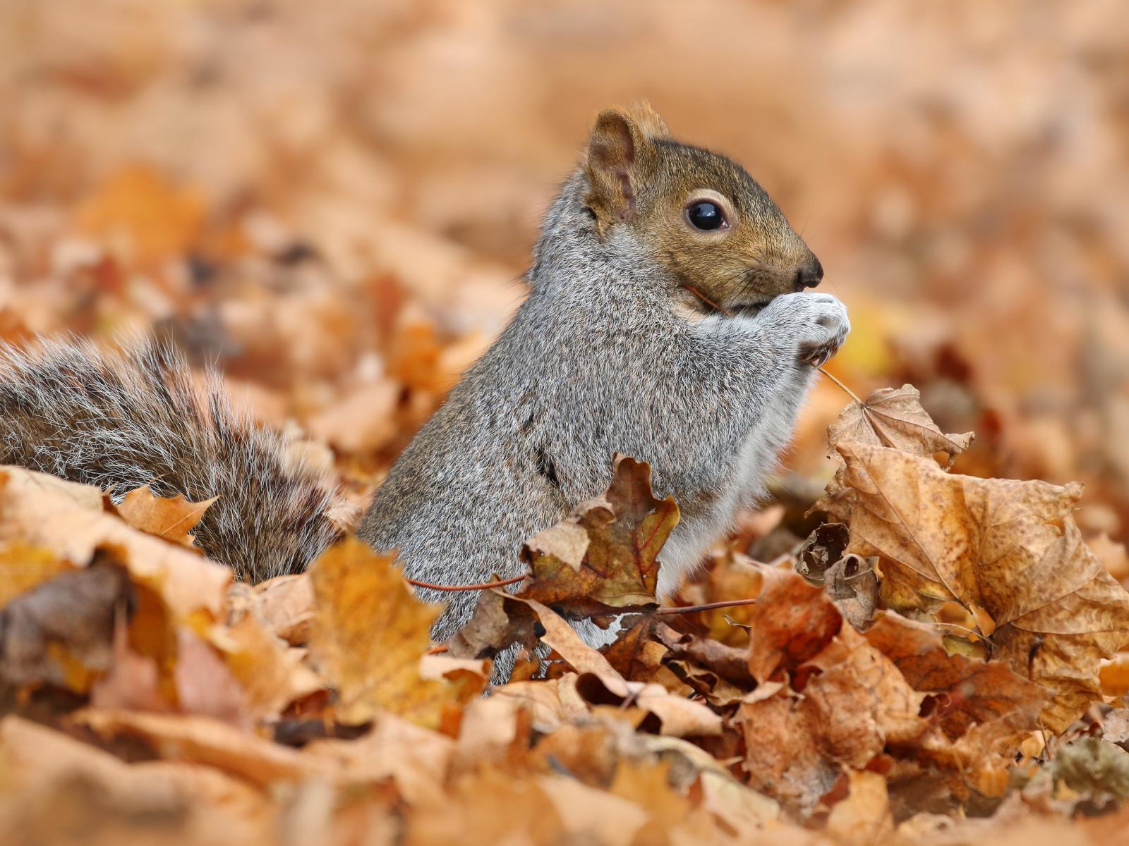 Wallpaper A small squirrel sits on dry foliage