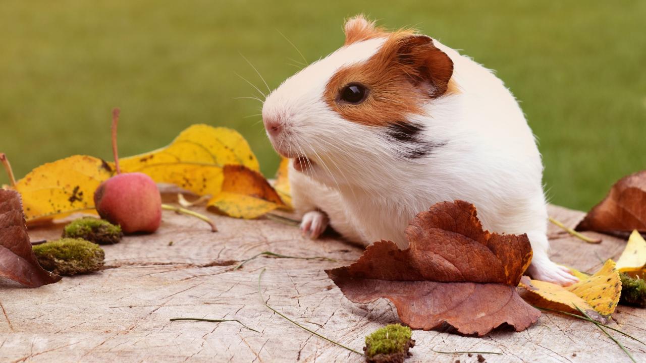 Wallpaper Guinea Pig sits on a stump with dry leaves