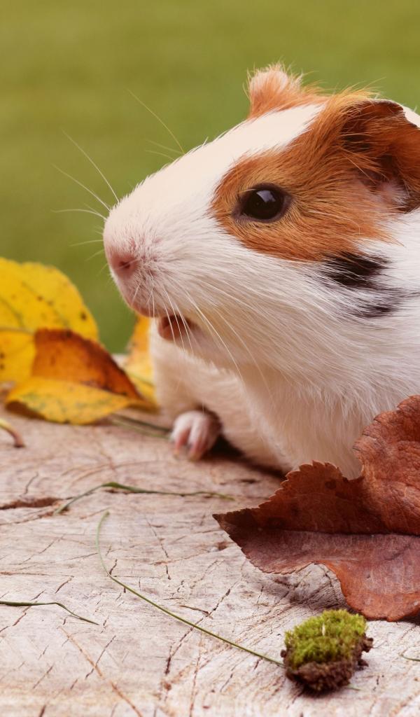 Wallpaper Guinea Pig sits on a stump with dry leaves