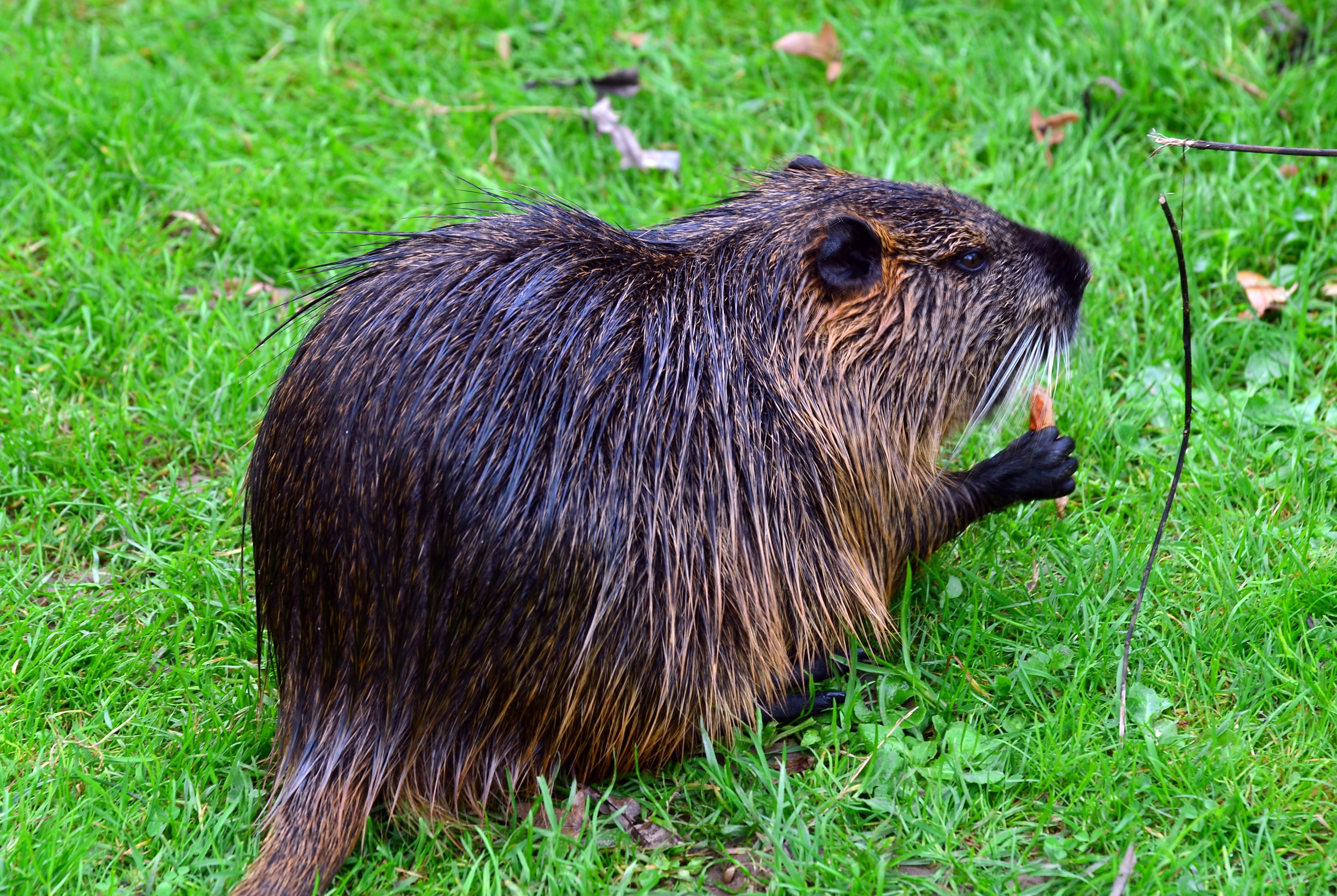 Wallpaper Wet beaver sitting on green grass