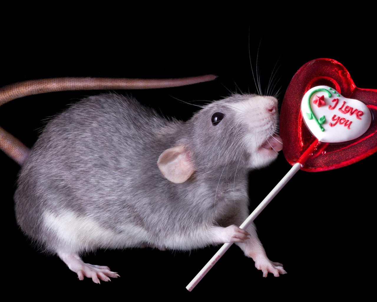 Wallpaper Gray rat with a lollipop on a black background