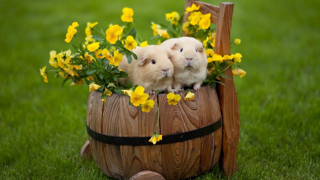 Wallpaper Two guinea pigs are sitting on a barrel of flowers