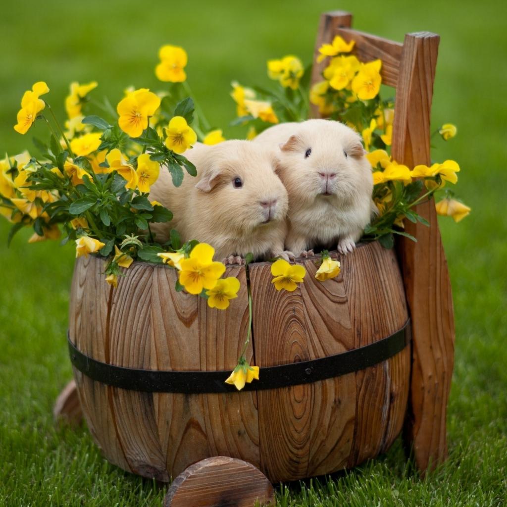 Wallpaper Two guinea pigs are sitting on a barrel of flowers