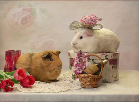 Wallpaper Two guinea pigs are sitting on a barrel of flowers