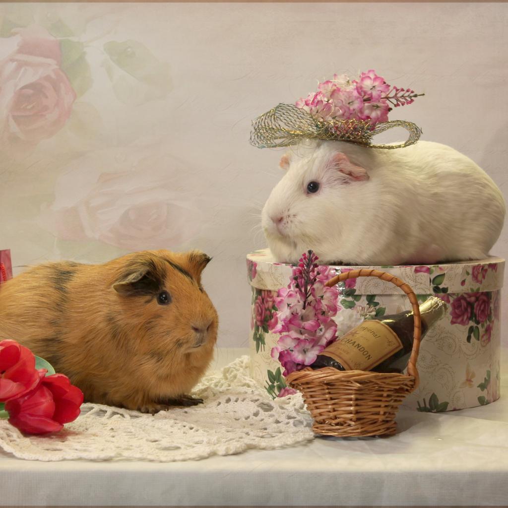Wallpaper Two guinea pigs are sitting on a barrel of flowers