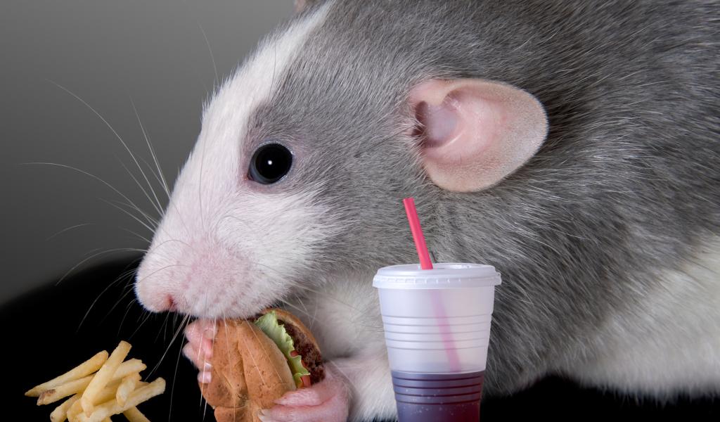 Wallpaper Gray decorative rat with a sandwich and juice