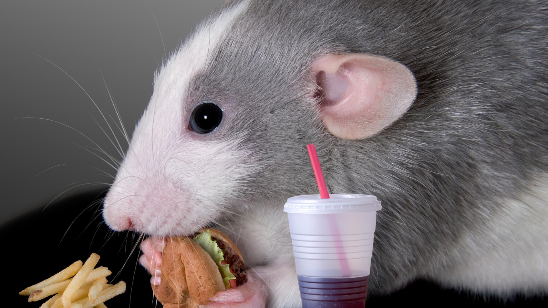Wallpaper Gray decorative rat with a sandwich and juice