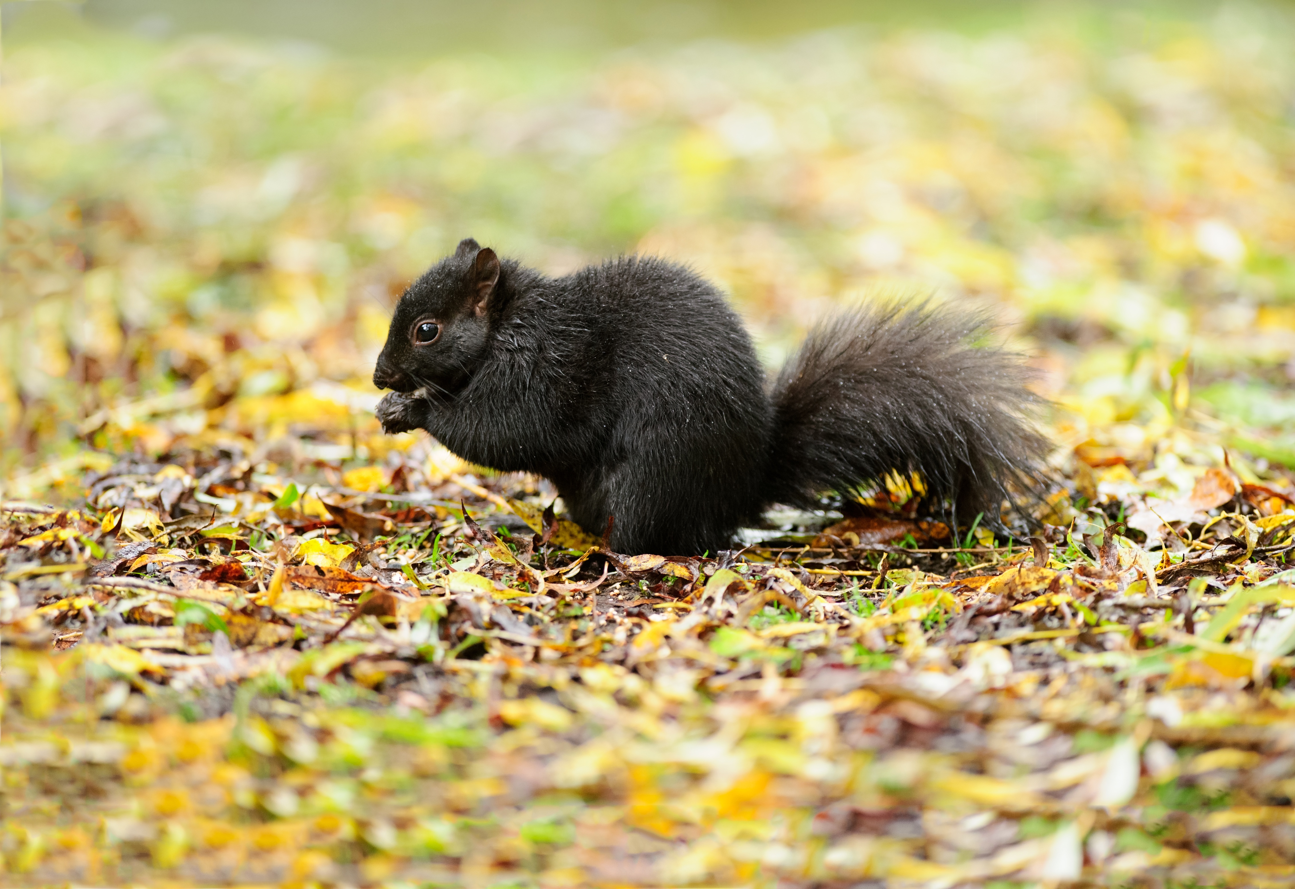 Wallpaper Black squirrel sits on a yellow foliage