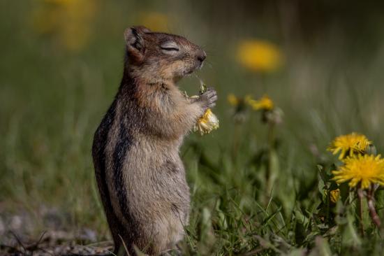 Wallpaper Gray Chipmunk nibbles yellow dandelions