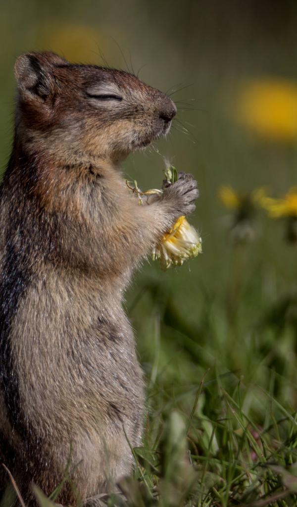 Wallpaper Gray Chipmunk nibbles yellow dandelions