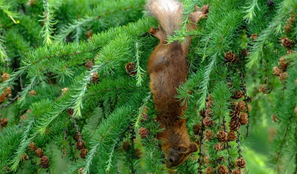 Wallpaper Squirrel nibbles a cone on the green branch of spruce