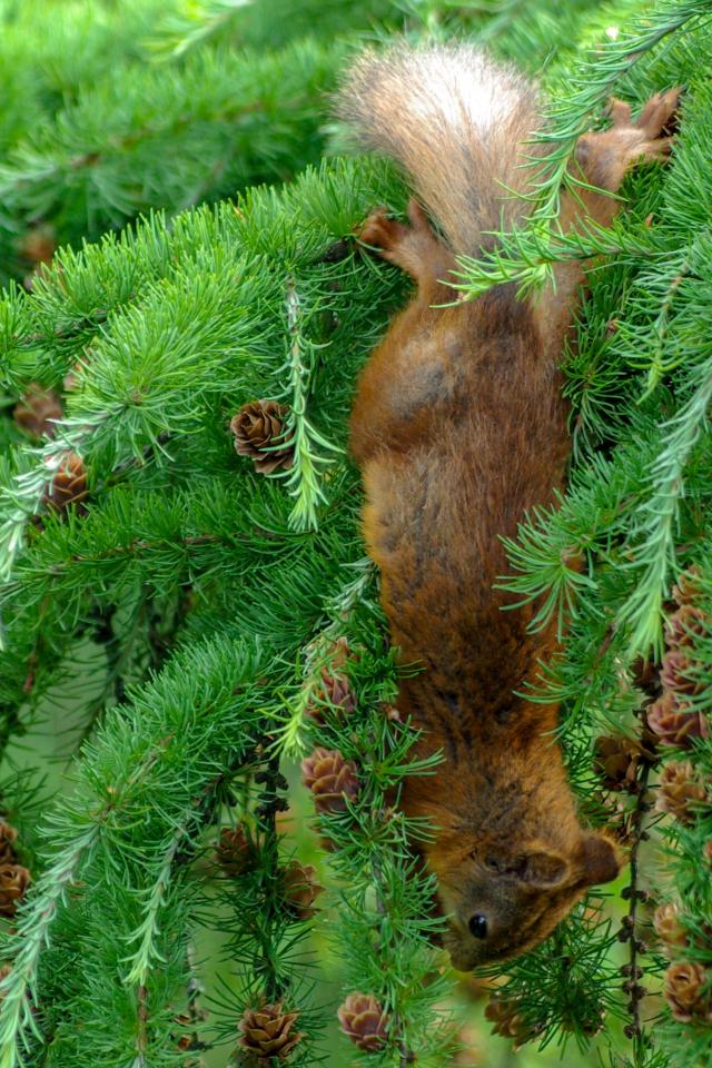 Wallpaper Squirrel nibbles a cone on the green branch of spruce