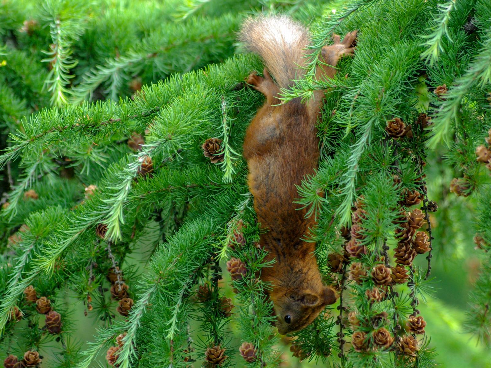Wallpaper Squirrel nibbles a cone on the green branch of spruce