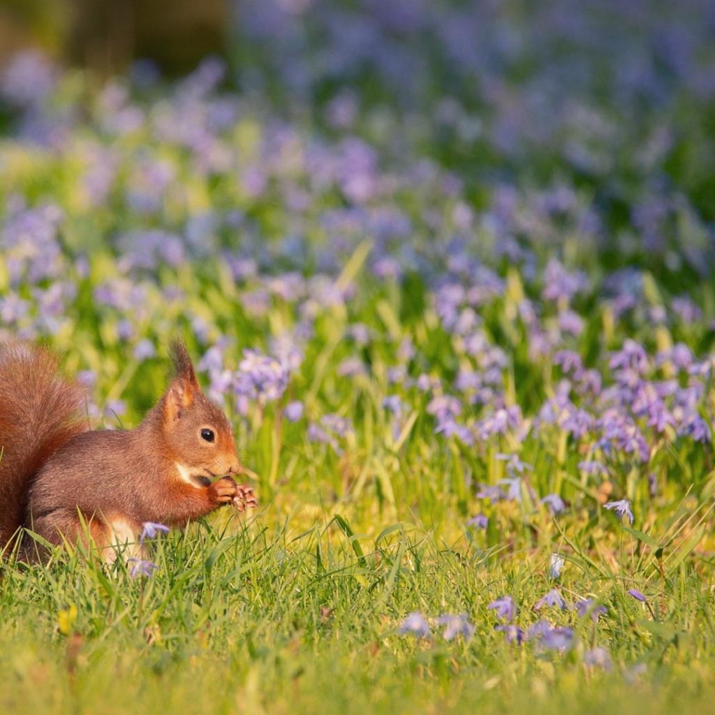 Wallpaper Little red squirrel sitting on the field with flowers