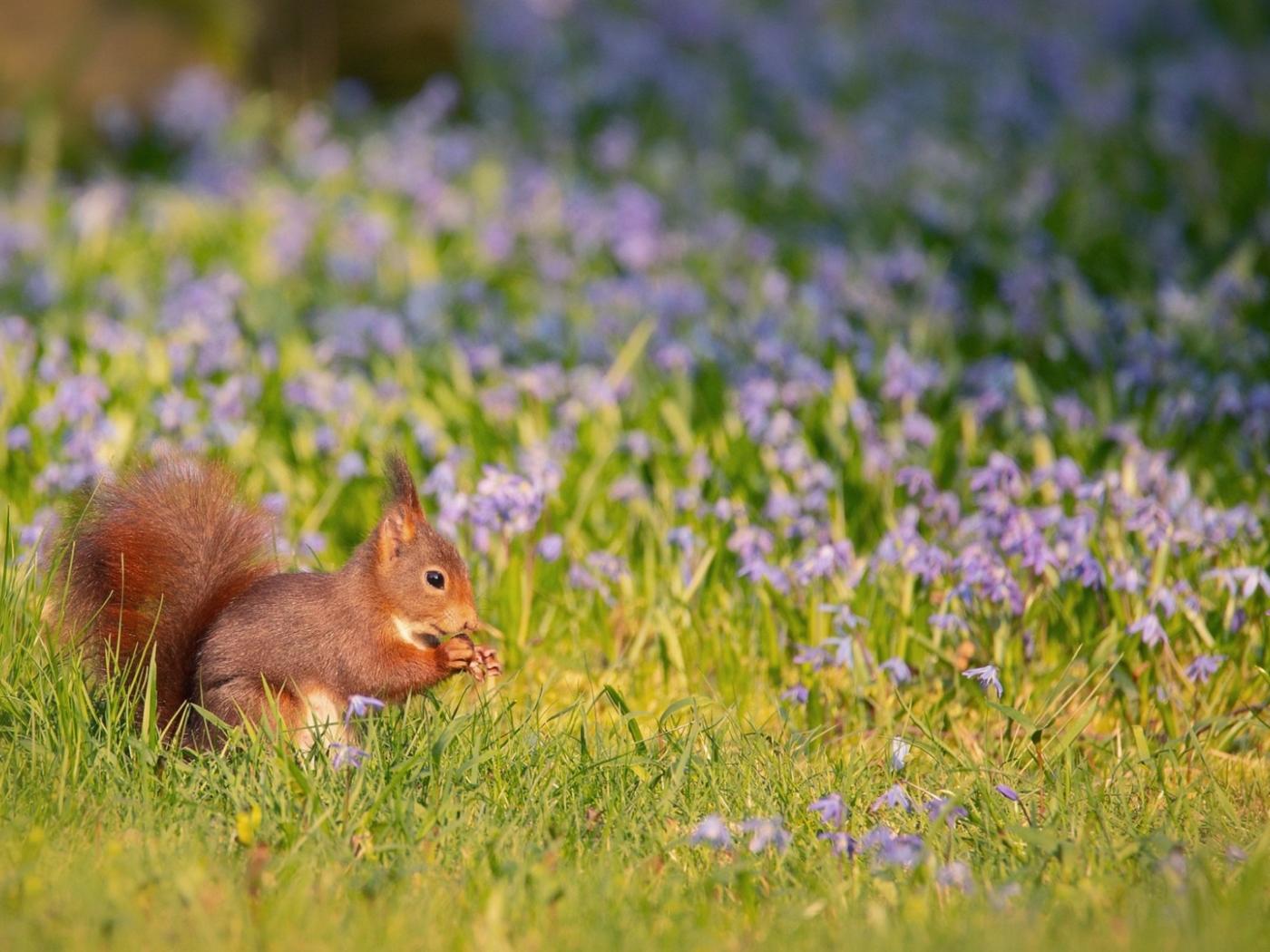 Wallpaper Little red squirrel sitting on the field with flowers
