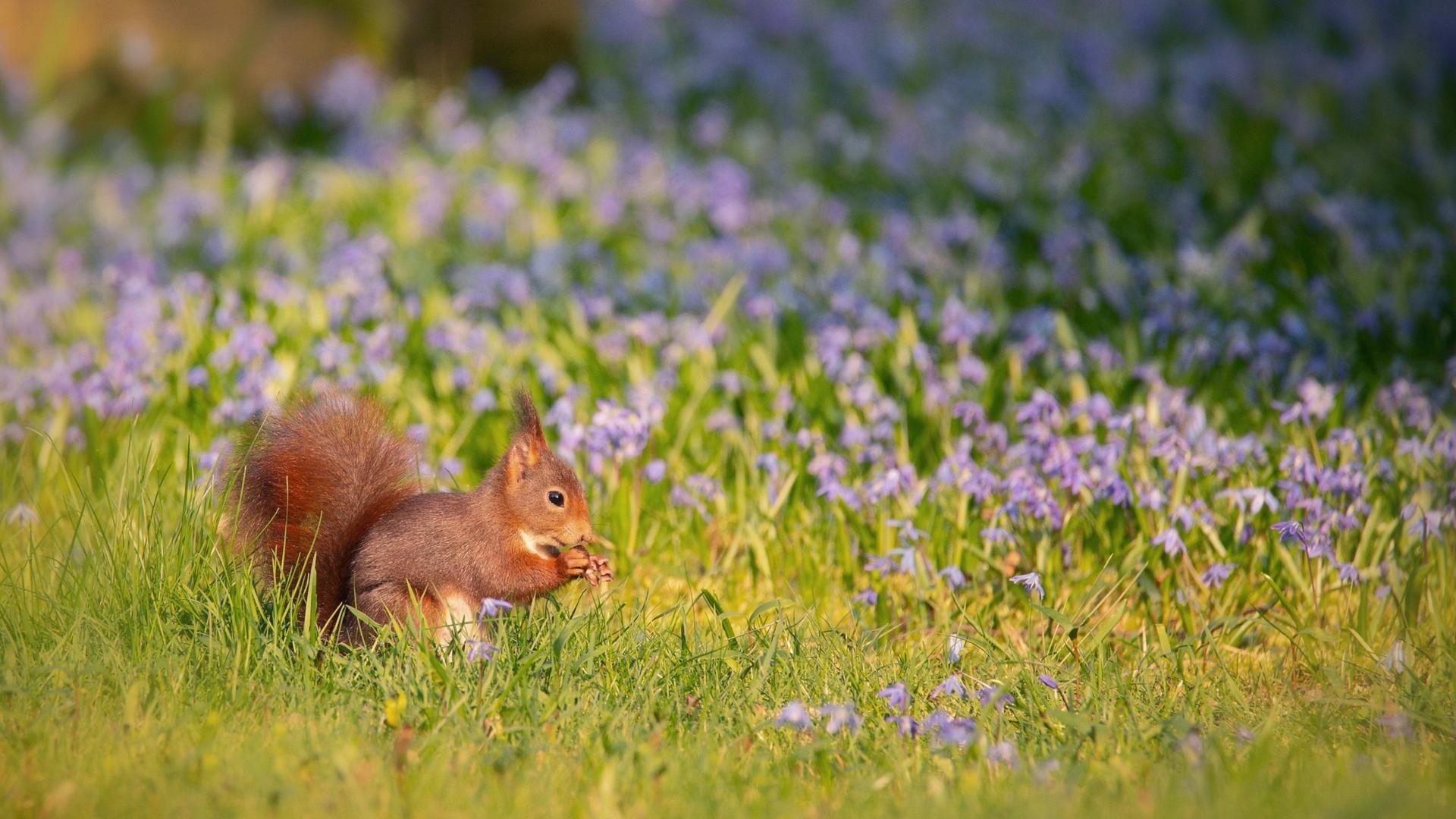 Wallpaper Little red squirrel sitting on the field with flowers
