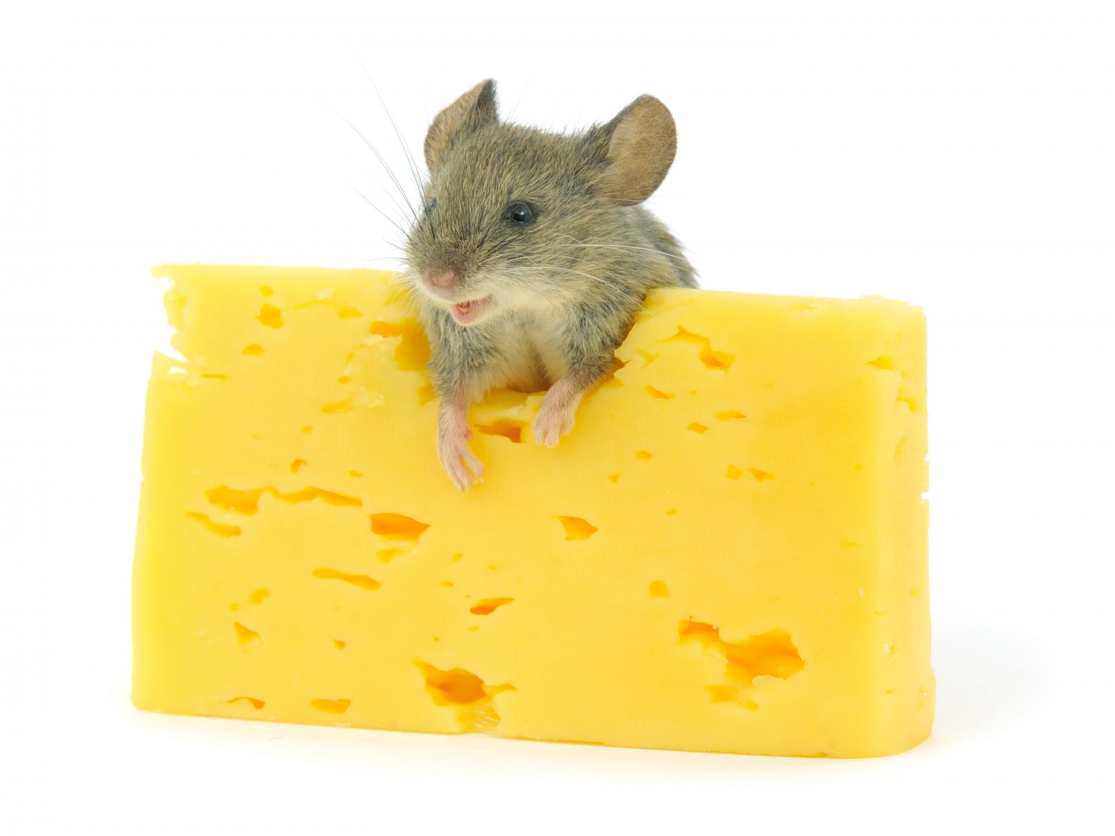 Wallpaper Little mouse with a piece of cheese on a white background