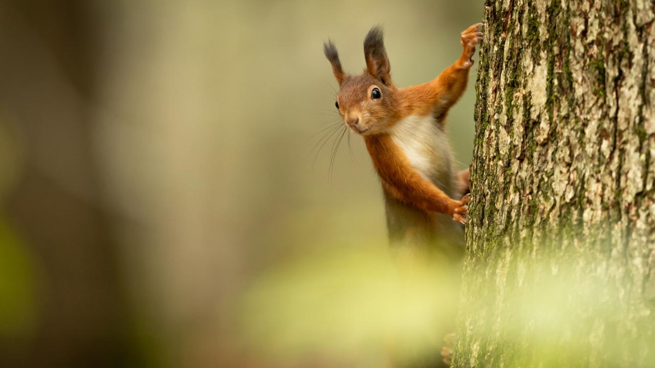 Wallpaper Fluffy cute redhead squirrel hanging on a tree.