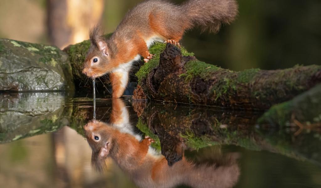 » Wallpaper Fluffy red squirrel drinks water