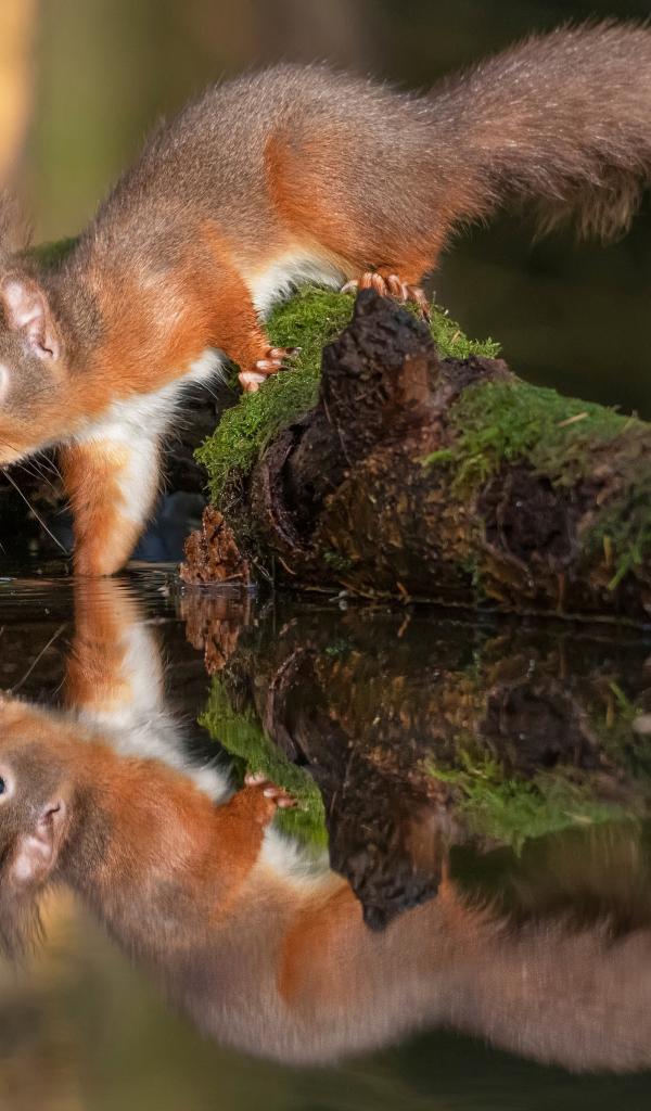 Wallpaper Fluffy red squirrel drinks water