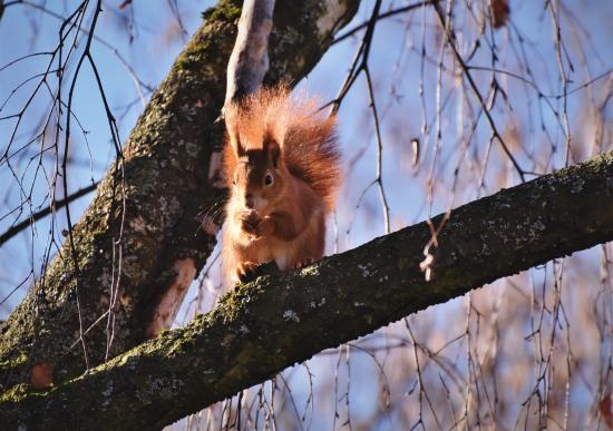 Wallpaper Red squirrel with a fluffy tail nibbles a nut on a tree