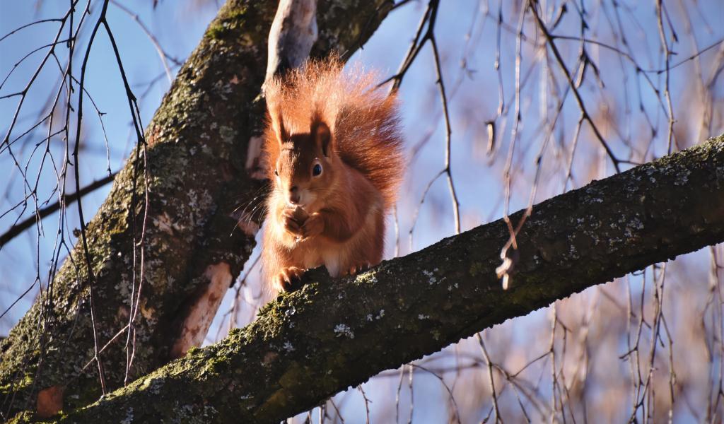 Wallpaper Red squirrel with a fluffy tail nibbles a nut on a tree
