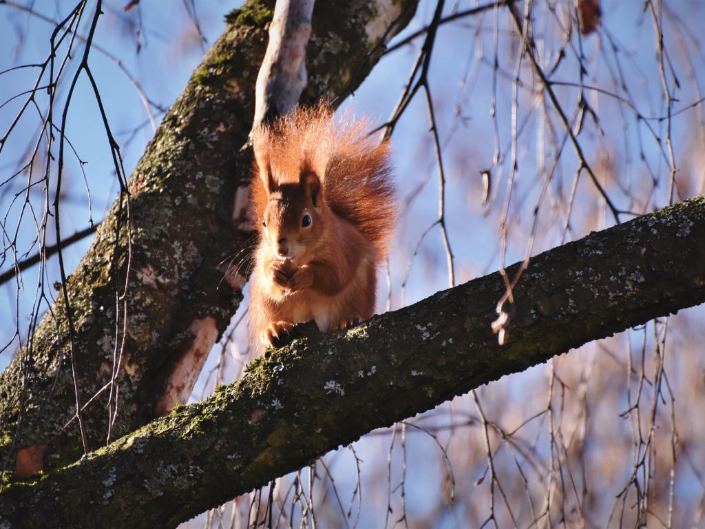 Wallpaper Red squirrel with a fluffy tail nibbles a nut on a tree